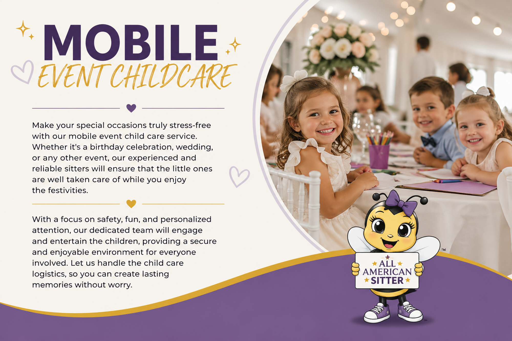 Make your special occasions truly stress-free with our mobile event child care service. Whether it's a birthday celebration, wedding, or any other event, our experienced and reliable sitters will ensure that the little ones are well taken care of while you enjoy the festivities.