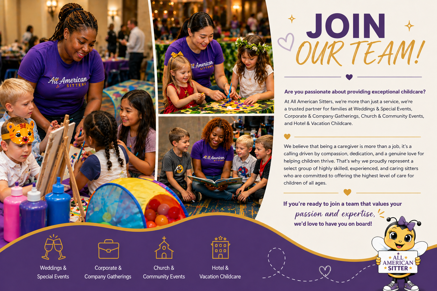 Are you passionate about providing exceptional childcare? At All American Sitters, we’re more than just a service, we’re a trusted partner for families at Weddings & Special Events, Corporate & Company Gatherings, Church & Community Events, and Hotel & Vacation Childcare.